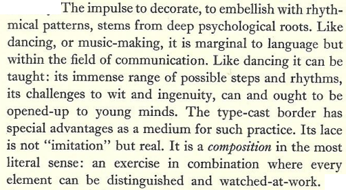 "The more primitive a people, the more they use ornaments. An Indian overloads everything—every boat, every rudder, every arrow—with decorations. Demanding decoration is to place oneself on the same level as the Indian. Our inner Indian must be conquered. The Indian says: This woman is beautiful because she has golden rings in her nose and ears. Men of higher culture say: This woman is beautiful because she does not wear rings in her nose or ears. The whole of humanity should aim to find beauty in the form itself instead of depending on decoration.'" Tschichold continues: "Today we see in the desire to decorate a tendency based on ignorance that our century must suppress."